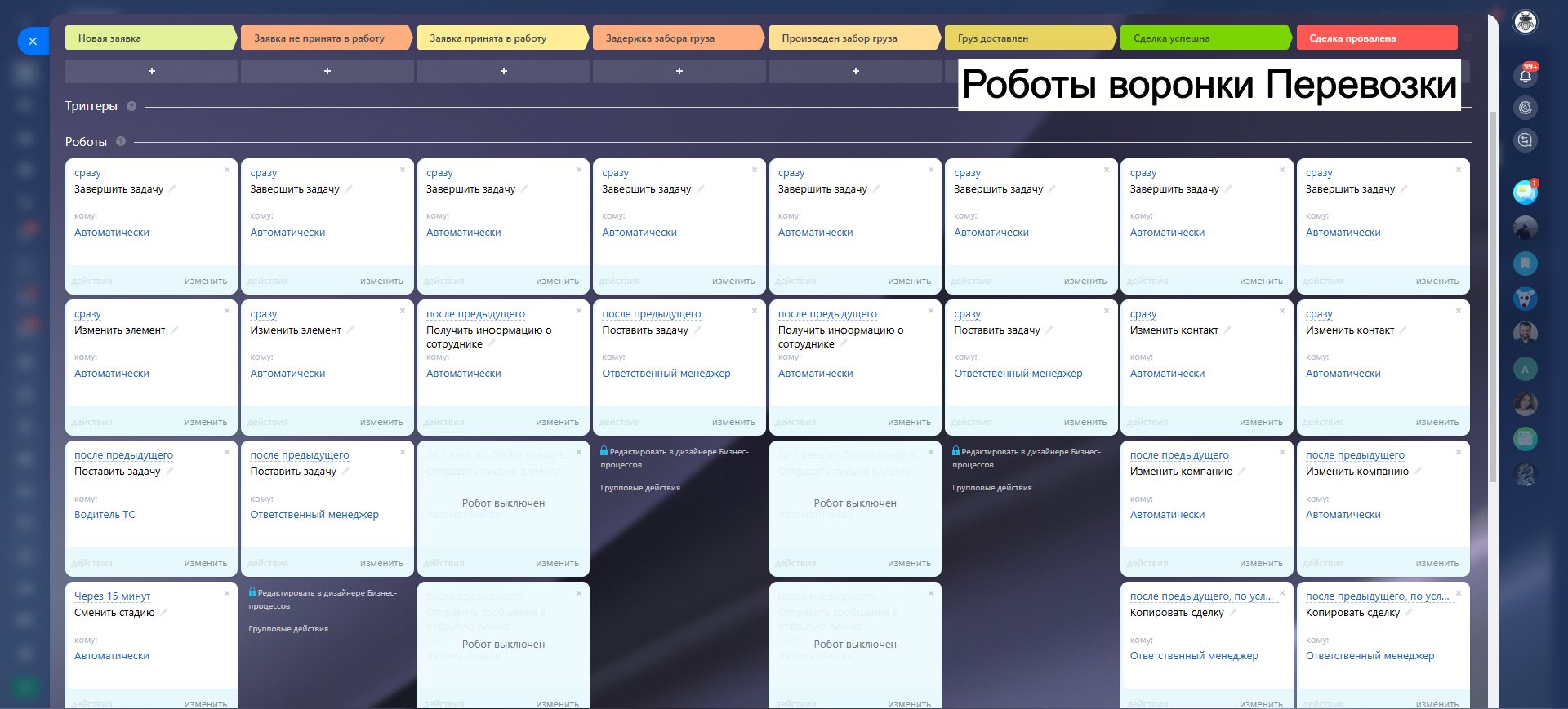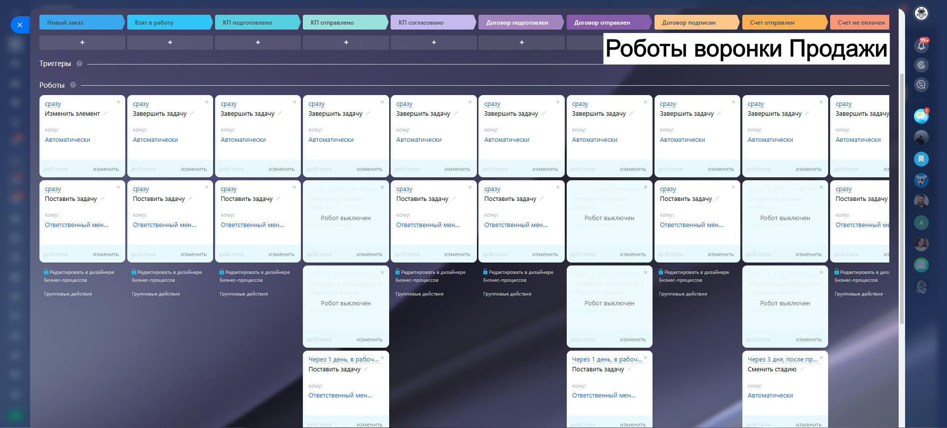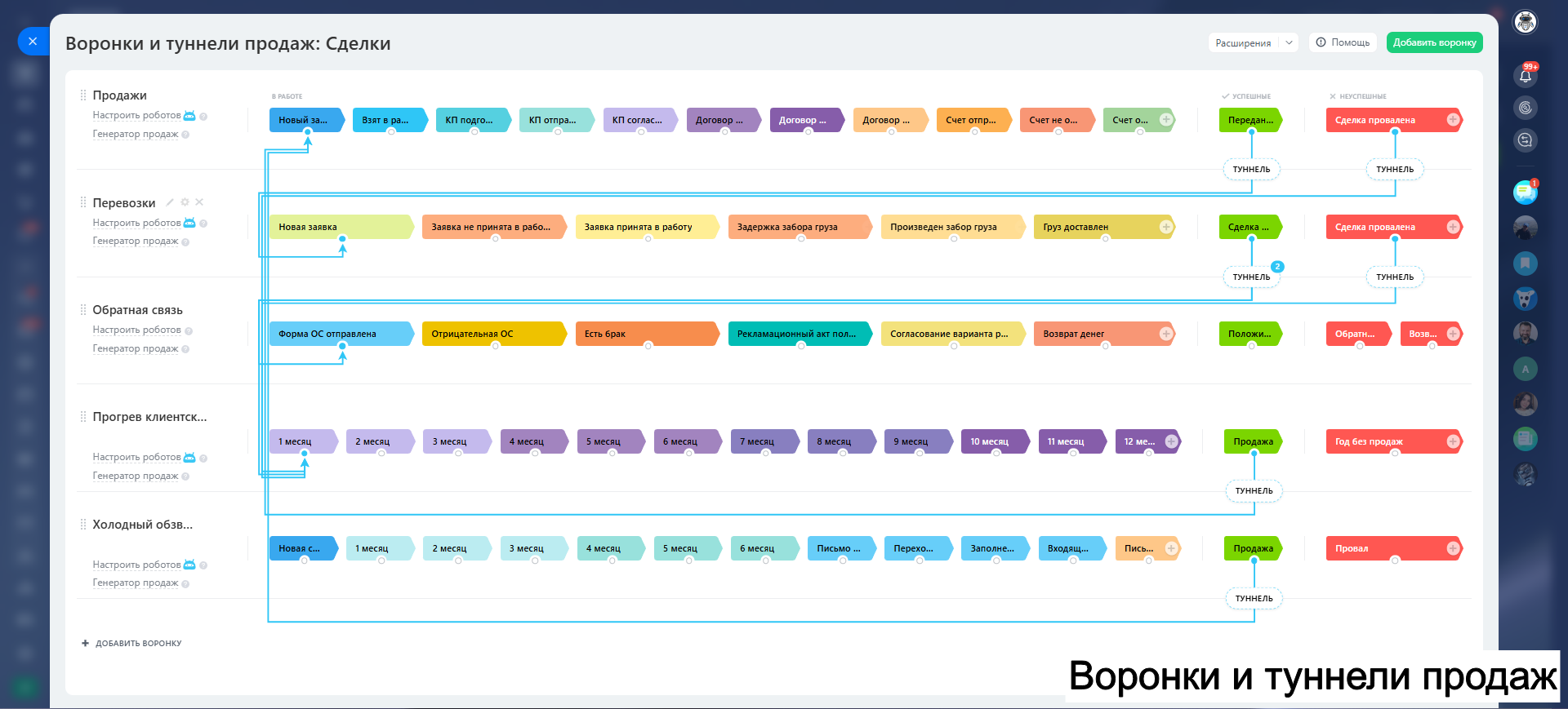 - 10 настроенных воронок: лиды, 5 услуг, закупка, действующий клиент, ОС, холодный обзвон, условный отказ