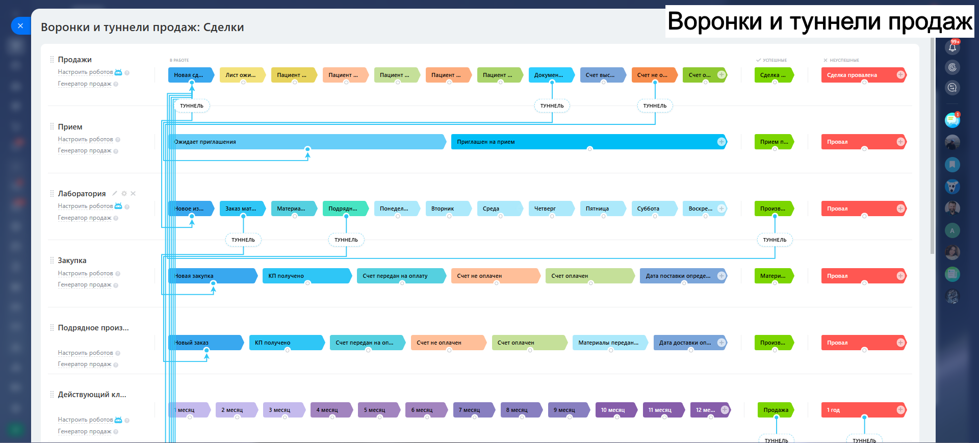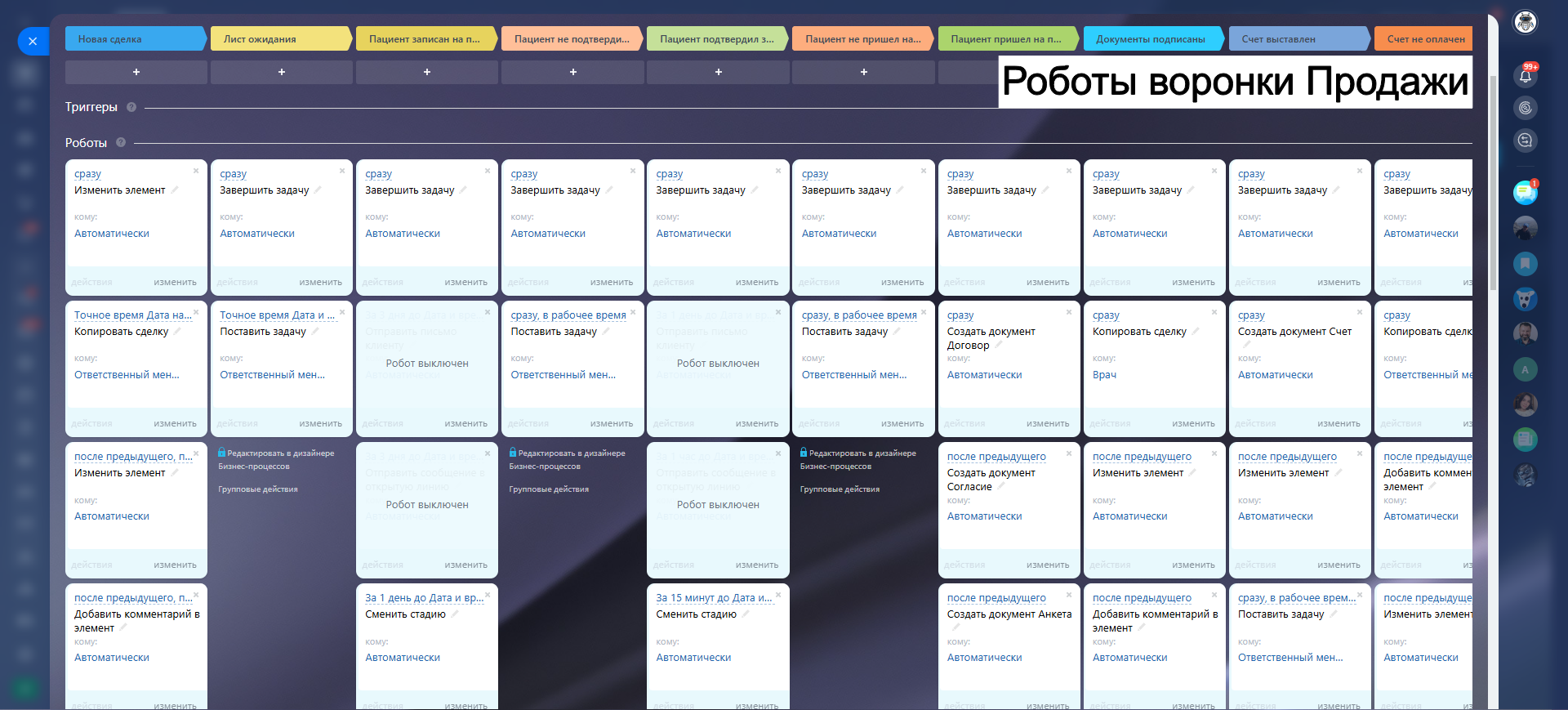 - Автозадачи на этапах лидов, записи, приёма, оплаты и дебиторки